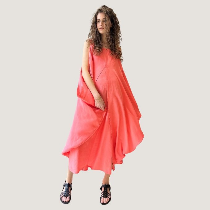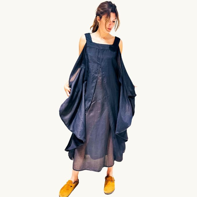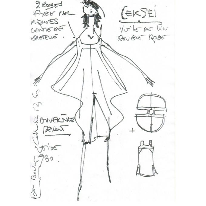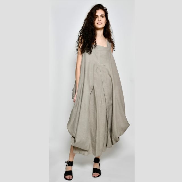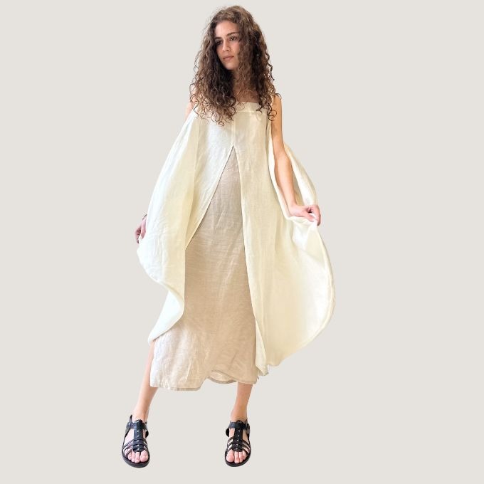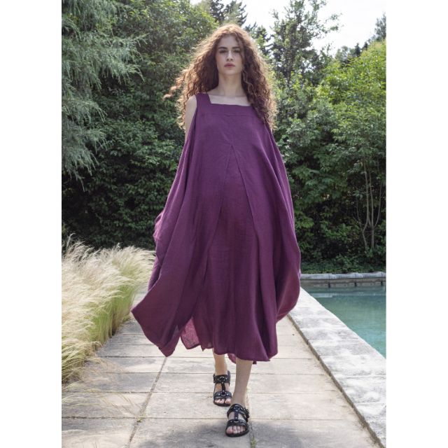La robe Cersei est une robe bain de soleil à double volume superposé, maintenue aux épaules et à l’encolure carrée avec poches et fentes aux côtés.